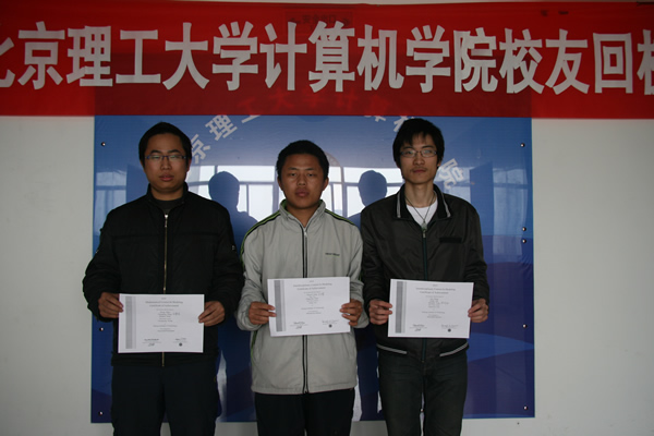 计算机学子在CUMCM2009、MCM2010大赛中连创佳绩:继2009年全国大学生数学建模大赛中获一等奖3人次,二等奖1人次后,又在2010年全美大学生数学建模大赛中获一等奖1人次,二等奖1人次,成功参赛奖1人次。“计算机*创新”已经成为一句嘹亮的口号,作为一代代计算机人传承的信念,永远激励着我们执着地追求着!秉承“自信 激情 协作 创新”的理念,计算机学子抒写着精彩和辉煌!