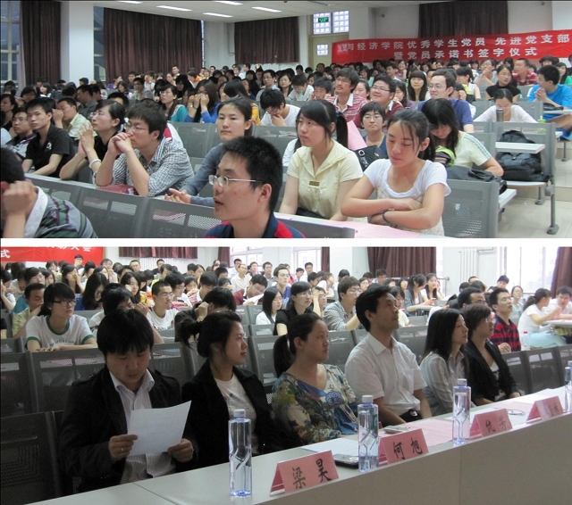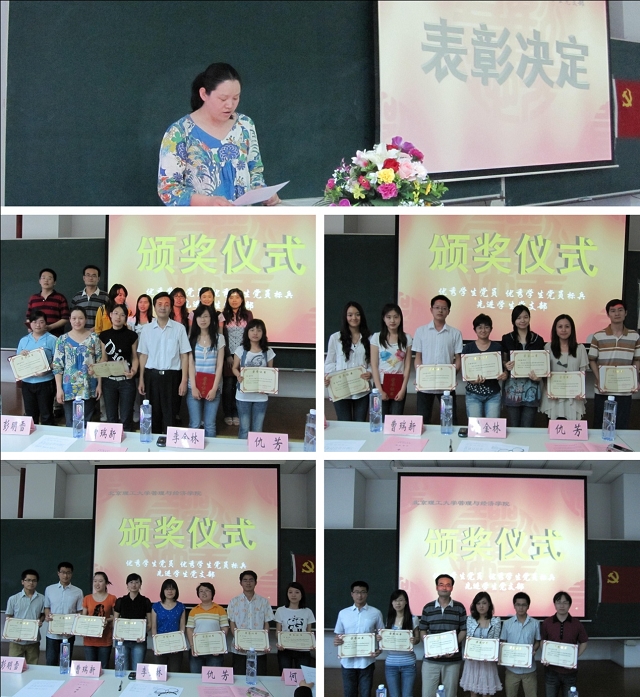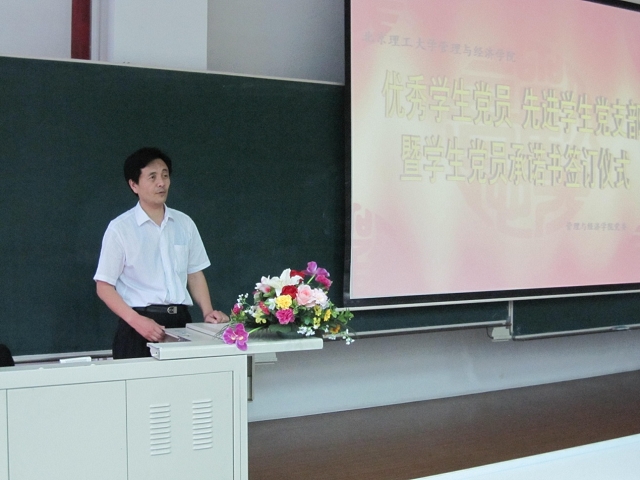 2010年6月2日19:00,管理与经济学院在研究生楼301举行了优秀学生党员、先进党支部表彰大会暨学生党员承诺书签订仪式。管理与经济学院党委书记李金林,副书记、副院长仇芳,本科生组织员曹瑞新,分团委书记彭明雪,研工委书记梁昊,分团委副书记何旭出席了此次仪式。管理与经济学院中关村校区全体学生党员参加了此次大会。