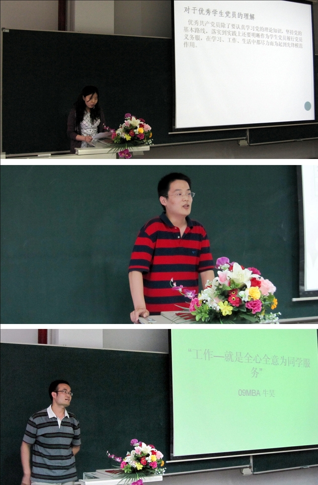 来自2009级硕士第3党支部陈虹枢、2009级博士生党支部张肖肖、09级MBA党支部牛昊三位同学作为学生党员标兵代表上台发言。
