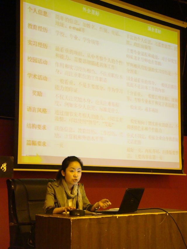 5月3日晚进行第二讲,主题是大学生求职就业的方法与技巧,由学院就业办公室董倩倩老师讲解,她从大学生就业资本的积累与准备、就业信息的索取和具体就业技巧等方面给学生们做了详细讲解,让同学们熟悉就业过程,掌握就业技巧。