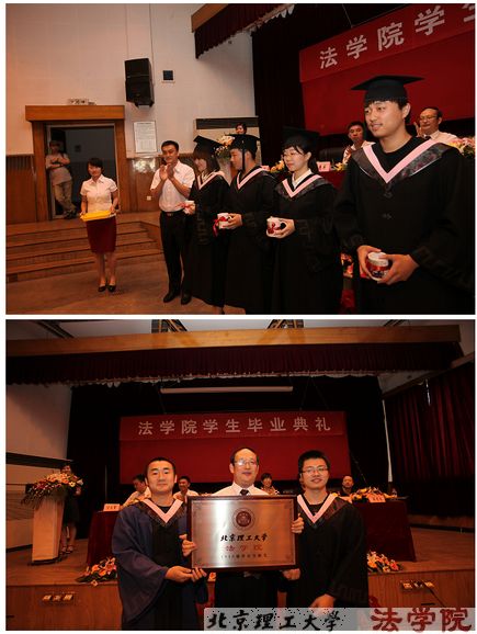 毕业典礼上,教师代表郭德忠老师以“物质化时代的法律人”为题发言,希望毕业生“堂堂正正做人,踏踏实实做事”,并祝贺毕业生圆满完成学业;优秀校友代表96级毕业生、现任 百泰酒业副总裁刘巍发言,表达了对母校的深深怀念和对学弟学妹们的真挚祝福;本科毕业生代表舒歆同学发言,表达了全体毕业生对学校领导和老师的感激之情和崇高敬意;研究生毕业生代表姜琨琨发言,表达了对母校的留恋和对同窗未来的祝愿,并带领全体毕业生宣誓,“传承谦虚谨慎、自强不息的理工传统;发扬团结勤奋、求实创新的理工精神;志存高远,锐意创新;勤勉做事,谦虚为人。用才华和智慧肩负起民族复兴的使命;用青春和热血承担起国家富强的责任。”的豪言壮语在报告厅中回响。