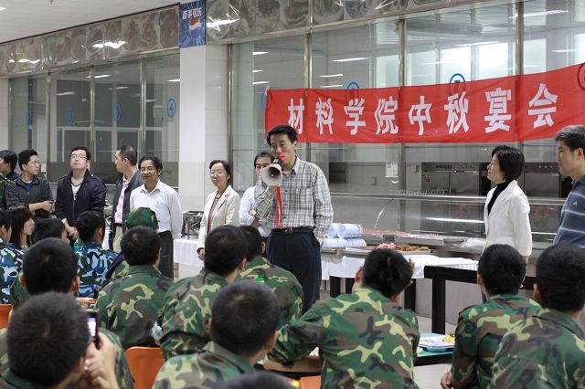 宴会在温馨的气氛中举行,王鲁书记为大家介绍与会的老师,并代表材料学院全体教师为新生送上诚挚的中秋祝福,祝愿同学中秋快乐、身体健康、学业有成,并预祝全体同学顺利完成军训任务,同时提请大家注意假期安全。