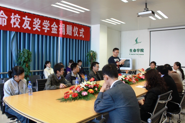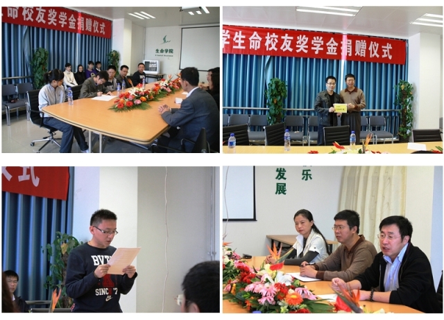 2010年9月23日上午,生命学院在学院会议室举行“生命校友奖学金”捐赠仪式,本奖学金由生命学院全体2007届本科毕业生共同以年度捐款方式捐赠并设立,出席本次捐赠仪式的有生命学院2007届本科毕业生代表,生命学院院长邓玉林、党委书记李汉军、副院长唐晓英、副书记副院长周连景和副院长李勤,仪式由分团委书记王征主持。