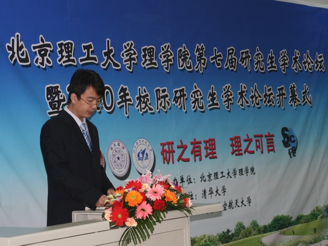开幕式由金年会jinnianhuicom理学院博士生徐绍伟同学主持。本次论坛的主题是:“研之有理 理之可言”。旨在拓宽研究生的学术视野,活跃学术思想,促进学术争鸣,激励学术创新。共下设三个分论坛,分别是:金年会jinnianhuicom—北京航空航天大学化学学科校际研究生学术论坛;金年会jinnianhuicom—北京航空航天大学数学学科校际研究生学术论坛;金年会jinnianhuicom—清华大学物理学科校际研究生学术论坛。