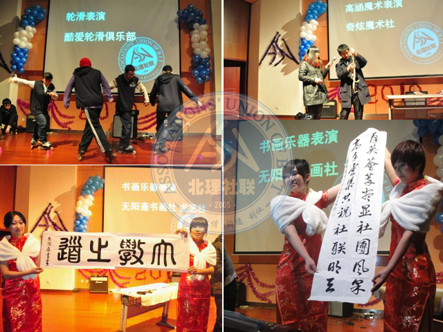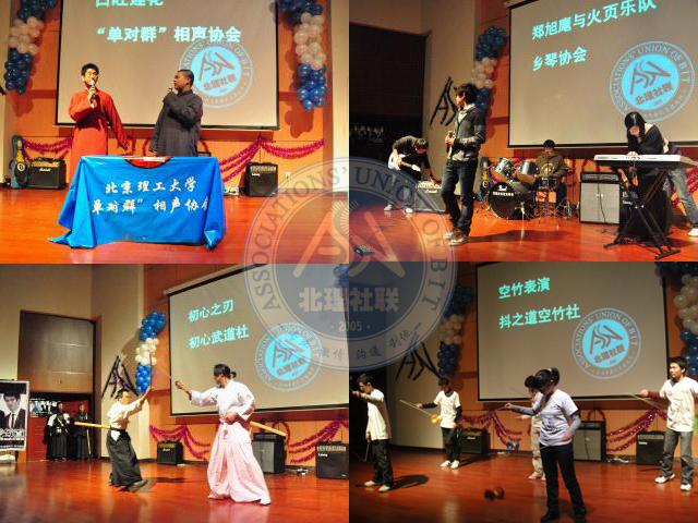 大学道晚会是金年会jinnianhuicom的传统晚会,它是展示大学生丰富多彩的社团生活的一个大舞台,值此北理社联五周年之际,此次晚会也拉开了社联五周年系列活动的序幕。晚会首先由街舞社的成员献上两段劲爆的街舞表演,街舞社成员高超的表演艺术和激动人心的音乐让全场气氛顿时活跃起来。随后主持人介绍到场的嘉宾,晚会便正式开始。晚会上各社团都拿出了自己的拿手好戏,资本市场协会和京工演讲团分别朗诵了《金钱》和《壮士行》,荡气回肠的朗诵牵动着大家对人生的思考,单对群相声协会的相声表演正如他们所表演的相声名字一样--《口吐莲花》,抖之道空竹社的空竹表演则不禁让人惊呼,原来空竹也可以这样飞舞,奇炫魔术社则告诉我们,什么东西撕了都不用怕,找魔术社就能恢复原状。武协的双截棍在黑暗中舞出奇炫的色彩、剑道社专业的剑道表演更是让人感觉武道的美丽。还有乡琴协会的乐队演唱、酷爱轮滑社的轮滑表演、黑白漫画社的cosplay等等,使得晚会现场一次又一次地次达到高潮,演艺厅里掌声、笑声、惊呼声不断。