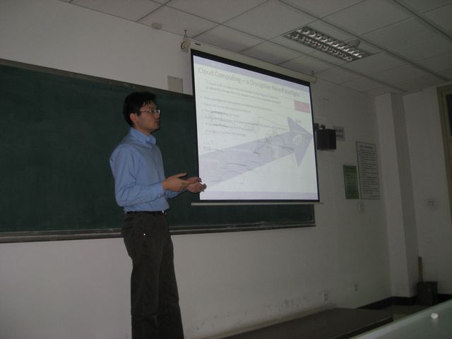 12月6日,IBM中国研究院孙科伟研究员应邀在研究生楼204为我院师生做了题为“In the Cloud? Above the Cloud?”的学术报告。选修《计算机软件与理论最新技术研讨》课程的研究生和计算机学院的部分师生聆听了此次报告。孙科伟2006加入IBM中国研究院,目前是分布式计算与系统组的研究员,主要研究方向为分布式系统、虚拟化和云计算,在OOPSLA,PODC,NOMS等顶级国际会议上发表多篇学术论文。