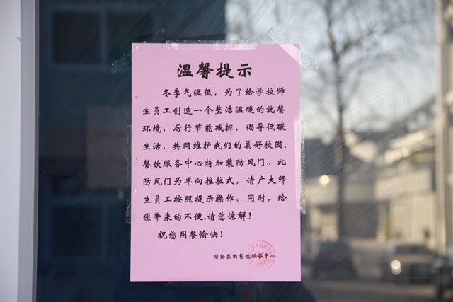 为了保证广大师生员工能够吃上热腾腾的饭菜,餐饮服务中心领导去各食堂现场实地察看,详细制定施工方案,在不影响食堂美观的前提下,决定对校内各个食堂进行改造,特加装防风门。