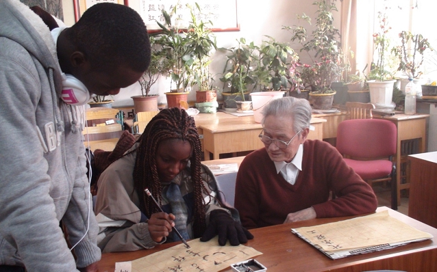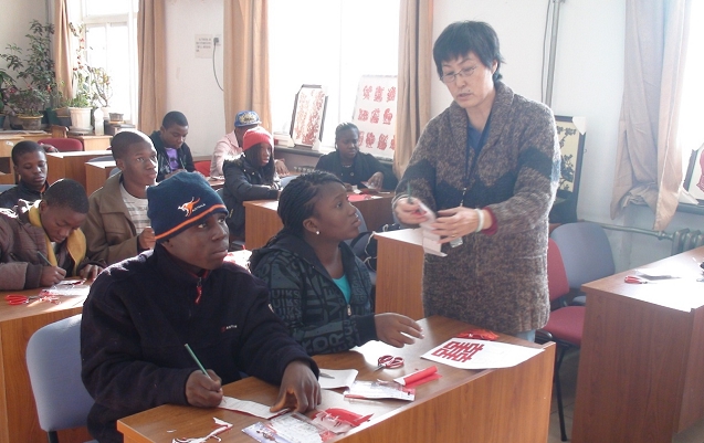 1月12日,冬令营来到远志楼,与老干部处书画协会和有才艺专长的老教师进行了交流。老同志们教这些热爱中国文化的尼日利亚年轻人学习中国传统的剪纸、国画和书法。老干部处的郑炎书记亲临课堂,向营员们介绍主讲老师,与他们交流心得感受。上午,林老师向营员们介绍了剪纸技法,她展示的剪纸作品令营员们赞不绝口,那些生动的剪纸图案极大地激发了他们的学习兴趣,个个热情高涨。在林老师的指导下,营员们学剪了“囍”字、以及苹果、老虎等图案。 活动结束时,营员们的裁剪作品已经有模有样,林老师挑选了优秀作品,还给作者颁了奖。下午,伍老师和徐老师教营员们学习国画和书法。徐老师开场为营员们简单介绍了中国传统国画和书法艺术,并且为每位营员取了一个中文名字,让他们学习中文名字的写法。营员们对于自己的中文名字表现出了极大的兴趣,纷纷向陪同人员询问自己名字的意义,还一遍遍地确认中文名字的准确发音。最后,营员们在宣纸上写下了“中国——尼日利亚友谊长存”几个大字。活动后,营员们纷纷表示受益匪浅,并且对中国传统文化产生了更加浓厚的兴趣。