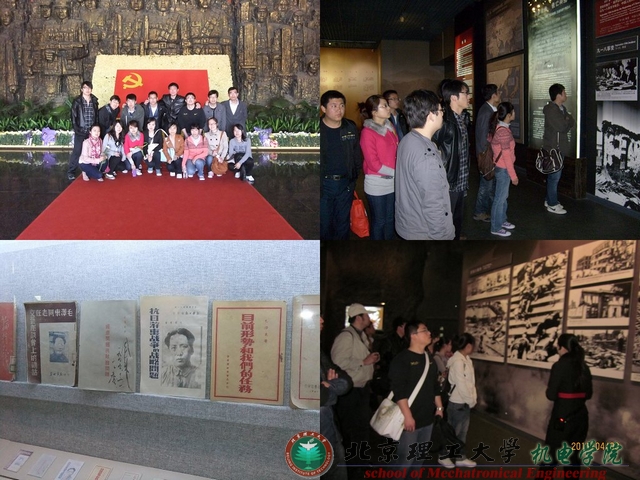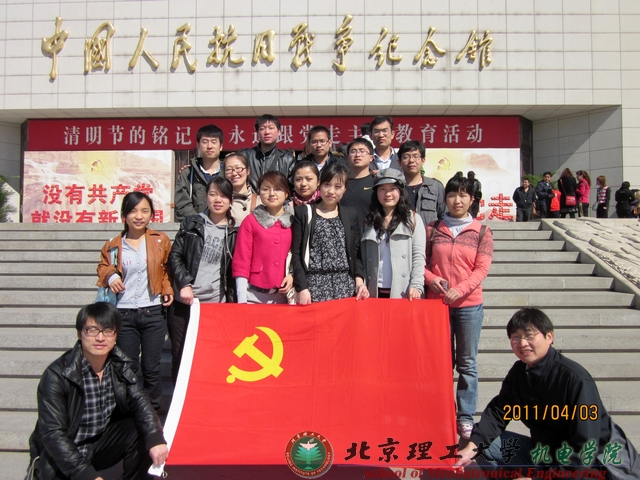 为庆祝建党九十周年, 4月3日2009级硕士1班党支部组织本班党员和入党积极分子参观了中国人民抗日战争纪念馆《伟大胜利》展览。通过深情回顾党的奋斗历史,学习党的光辉传统和优良作风,以增强党组织的凝聚力和战斗力,并激发研究生党员的历史责任感。
