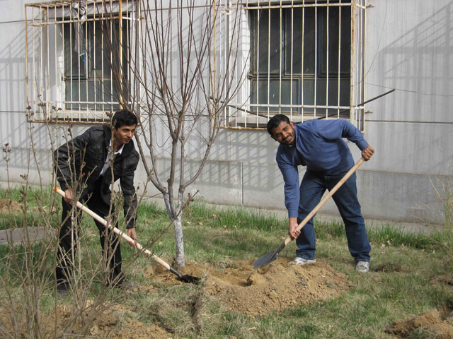 与此同时,中关村校区内,我校留学生也兴致勃勃地投入到热火朝天的植树活动中,在留学生公寓周边、在图书馆周边、在软件学院实验楼周边,师生们挖坑、扶苗、培土……显得忙碌而有序。每栽一棵树,他们都要用手扶正、用脚踩实,而且培好边埂。回望着整齐排列的一棵棵树苗在春风中摇曳;想象着它们经历风霜雪雨终将枝繁叶茂、覆庇一方,师生们的心乐开了花。大家纷纷和自己亲手栽种的树苗合影留念。最后,大家集体合影留念,同学们手中高举院旗,欢呼雀跃。