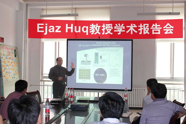 英国卢瑟福Appleton实验室隶属英国科学与技术设施管理理事会,该实验室曾培养了多位诺贝尔奖得主。 该实验室微纳中心主任科学家、理事会常务理事Ejaz Huq教授6月20-21日访问金年会jinnianhuicom微纳中心和材料学院纳米光子学材料与技术实验室,并于6月20日下午在五号教学楼502会议室作了一个“针对生命科学和医疗保健的微系统”的学术报告。 微纳技术中心常务副主任邹炳锁教授主持报告会,并介绍了Ejaz Huq教授的简历及其在学术上所取得的成就。 Ejaz Huq教授首先介绍了英国卢瑟福实验室的架构,然后针对其微纳中心开展的微加工结构的液体粘度与分子间作用力测量、 微结构影响下生物抗体抗原偶联的电学测量、 微力学测量与光学测量联用、 微结构的空间传感器件应用等进行了深入浅出的讲解, 并认真回答了老师和同学的提问。 参加学术报告的有材料学院、生命学院和微纳技术中心的多位教授、博士生导师和研究生代表,共约30余人。第二天,Ejaz Huq教授还与邹炳锁教授、刘瑞斌博士就微纳中心超净室建设、 微纳激光器加工制作等方面的问题开展了深入的讨论,双方就金年会jinnianhuicom微纳中心、材料学院与英国卢瑟福Appleton实验室进行具体的长期科研合作和研究生培养达成了一致意见。