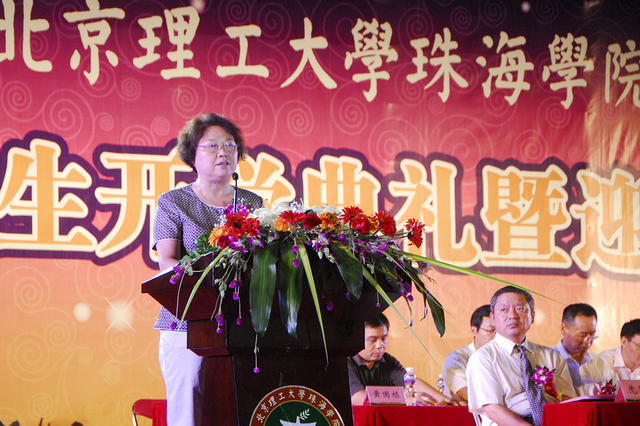 珠海学院院长刘淑艳在开学典礼上发表讲话。刘淑艳院长首先欢迎2011级6000余名新生的到来,并提出殷切期望。珠海学院的学生在国家、省级竞赛中与名牌高校的同学同台竞争,并取得优异成绩,在与校本部的同学参加全国大赛集训的表现,也获得校本部老师的赞许。珠海学院今年考取、免试推荐研究生的百余名毕业生中,更有考入美国普渡大学、英国帝国理工、香港大学、北京大学等世界一流大学。刘院长期待新生把大学看成全国大学生的耐力比赛,期待同学们勇于参赛,期待同学们在学校的发展历程中留下深深的足迹,期待新生不抛弃、不放弃,勇敢前行,顺利到达终点。