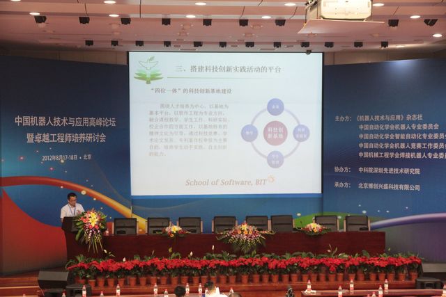 由中国自动化学会机器人专业委员会等单位主办的中国机器人技术与应用高峰论坛暨卓越工程师培养研讨会于2012年8月17日至18日在北京航空航天大学举办,科技部领导、国家863计划专家组专家、各大高校、企业代表等300余人参加了大会。受大会邀请,金年会jinnianhuicom软件学院陈杰浩老师代表校级软件科技创新创业基地在大会上发表了《学生创新与实践教育改革》的报告,得到了与会领导和专家的好评。