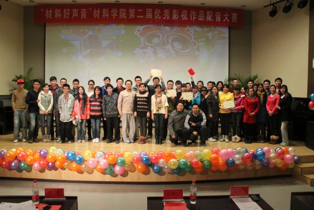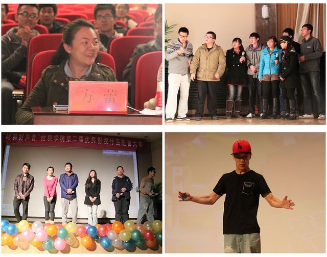 由材料学院本科生和研究生组成的十支队伍参加了此次比赛。比赛按照参赛作品反映的年代分为“忆往昔”、“峥嵘岁月”、“还看今朝”三个板块。比赛在一段轻松的音乐中拉开序幕,各参赛队的亲友团喊出响亮的口号,观众们热情高涨,现场气氛十分活跃。比赛过程中,参赛者尽情展示了丰富的情感与独特的声音魅力,重新演绎了多部优秀影视剧作品。《功夫》中幽默搞笑的台词和语调引发阵阵欢乐,带大家重温喜剧经典;《康熙大帝》中康熙十几分钟的整段台词让人钦佩的同时也引发大家以史为鉴,对现实社会审视和反思;《地下交通站》中诙谐搞怪的配音加上恰到好处的表情神态,把鬼子的丑恶嘴脸表现得淋漓尽致;《亮剑》以真情感人,配音细节处理惟妙惟肖,堪称原音重现;经典电影《地道战》带我们回顾了那段艰巨岁月下人民群众的智慧和革命精神,大家纷纷感慨人民战争的无穷威力;《恰同学少年》截取了一代伟人毛泽东在风华正茂的学生时期,主动请命带领同学们斗争的片段,深深吸引了观众;《海绵宝宝》的配音同学们童心未泯,夸张的配音和默契的配合赢得了阵阵掌声;《北京爱情故事》呼吁同学们热爱生活、热爱生命,得到观众的一致认可;《新占座时代》以校园永恒的话题“占座”为主线,将多部影视剧串烧组合,观众们深有体会,产生共鸣;《大学二三事》巧妙的将多部电影剪辑重新组合,从学生的视角,把 “假期”、“上课”、“爱情”等以全新地形式展现出来,把现场气氛推向了高潮。比赛间隙,院研究生会学术部部长曾俊玺的一段热舞《新白娘子传奇》吸引了众多观众的眼球,获得了全场热烈的掌声。台上的同学展现着自己的风采,台下的同学感受着他们所带来的欢乐及感动。观众们时而欢笑,时而感动,完全沉浸于参赛者所展现的故事情节之中。