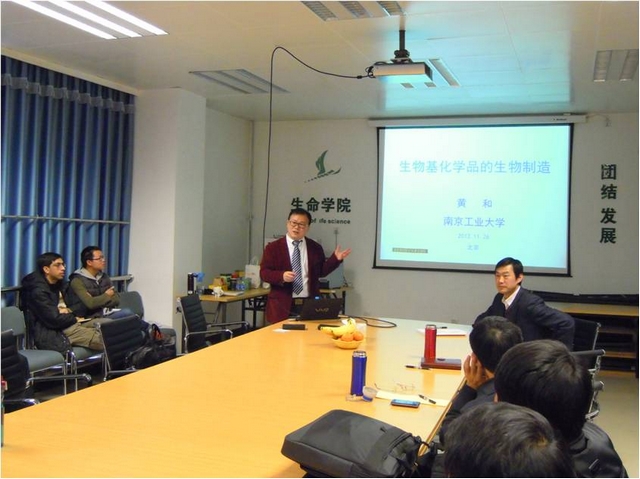 2012年11月26日,应生命学院李春教授邀请,南京工业大学科技处处长、国家杰出青年基金获得者黄和教授等一行三人来生命学院参观。黄河教授为北理工师生带来了题为“生物基化学品的生物制造”的报告,李春教授主持了这次学术报告会。北理工生命学院党委书记李汉军、屈锋教授、赵东旭副教授、郭淑元副教授、李艳菊副教授、周晓宏博士和清华大学吴玉龙教授、天津大学巩金龙教授及北理工部分研究生参加了报告会。