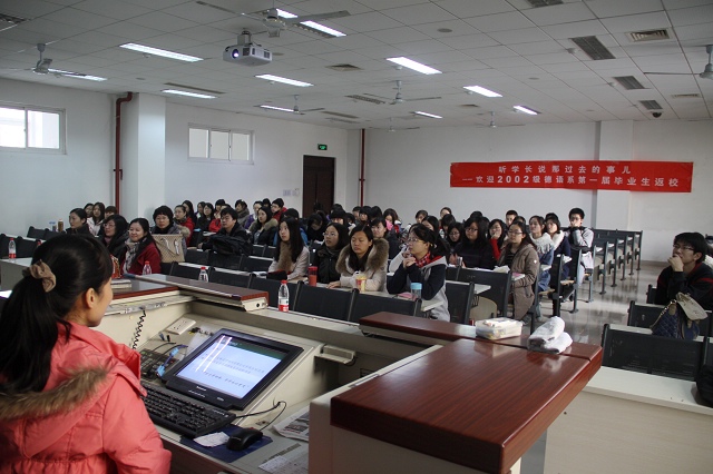 2012年12月1日上午10点,“听学长说那过去的事儿”——外国语学院德语系第一届毕业生返校交流会在理科教学楼104正式开始。来自外国语学院副书记副院长吴文君、02级德语系的四名校友代表出席报告会。辅导员周芳集携2010级、2011级、2012级德语专业学生参加报告会。报告会由吴文君老师主持。