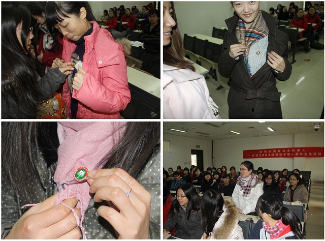 四位校友发言完毕,外国语学院的同学代表为她们佩戴上了校徽,再次铭记我们都是理工大学外国语学院的学生,我们都是相亲相爱的一家人。
