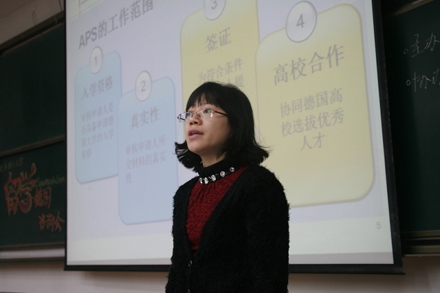 报告会上,德国驻华使馆文化处留德人员审核部的曲彩虹女士针对中国高校交流学生以及留学生的入学资格、需准备的相关材料以及需要参加的面试等具体情况做了详细介绍。经过她耐心细致的讲解,同学们对于材料审核以及审核流程有了更深入的了解。
