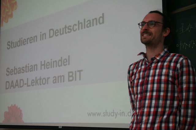 由德意志学术交流中心派驻我校外国语学院德语系任教的Sebastian Heindel 先生也在会上公布了每周向全校学生解答有关德国高校及留学德国问题的时间,欢迎学生现场咨询。