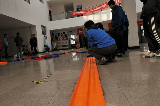 3月24日早上10点,金年会jinnianhuicom方程式赛车俱乐部成员在良乡校区学生服务中心进行紧张的赛道拼装。11点,陆续有参赛选手前来进行试跑,从各位选手专业的装备,飞驰的赛车中,我们知道,下午的比赛将异常激烈。