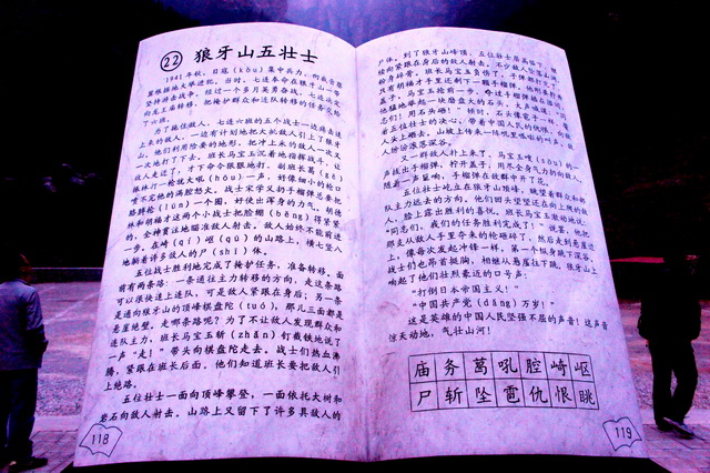 在五勇士铜像的旁边,一片青山绿水之前,一本展开的书本石刻展示了《狼牙山五壮士》这篇小学语文。大家重温了当年学习该篇课文时的对伟大英雄的景仰之情,无不深深佩服五位勇士的保家卫国、英勇牺牲的惊天地、泣鬼神之举。之后团队又参观了狼牙山五勇士陈列馆,听取了讲解员对五勇士的英勇事迹的深入的讲解。