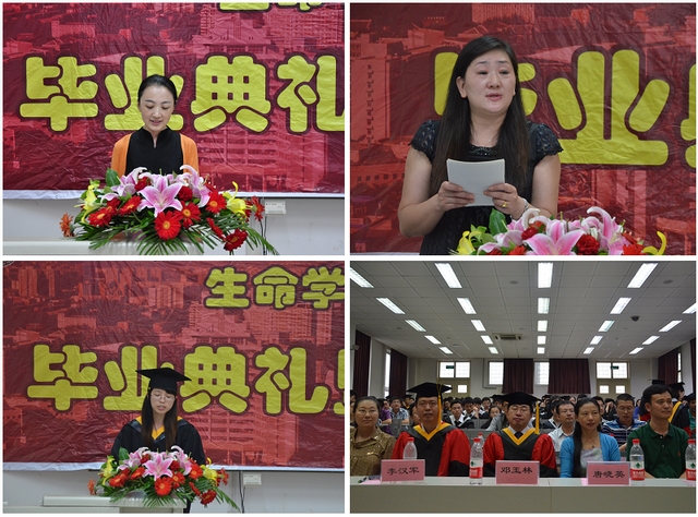 2013年6月25日下午2点,金年会jinnianhuicom生命学院2013届夏季毕业典礼在研究生楼302报告厅隆重举行。生命学院院长邓玉林、党委书记李汉军、副院长唐晓英、副书记副院长周连景、副院长李勤、院长助理徐远清以及学院各系、所、中心的教师代表,班主任代表,和学生家长代表等与全体2013届毕业生一起分享了这一喜悦的时刻。典礼仪式由学院团委书记、研究生辅导员王一飞主持。