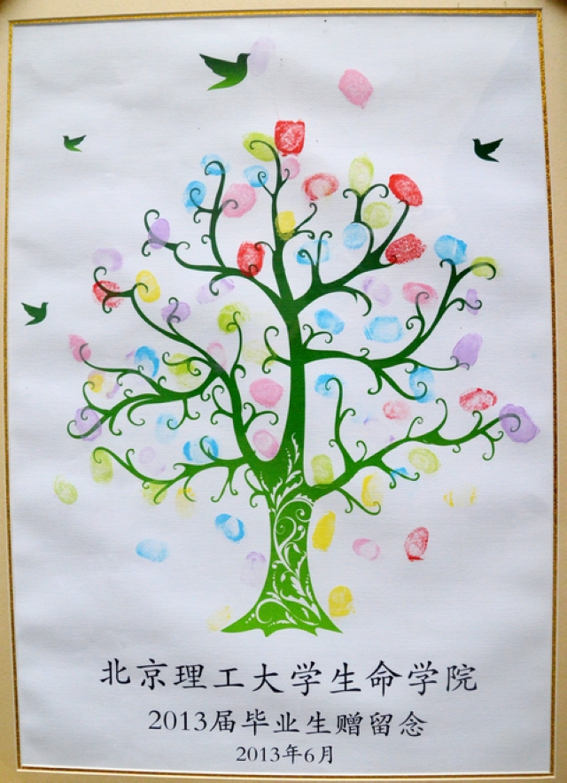 2013届毕业生集体用指纹画出的生命之树,是一颗幸福之树,也是收获之树。每一个指纹都是一份独一无二的祝福。当树叶开满枝头,这里便载满了最诚挚的祝福。在毕业之际,衷心地祝福生命学院和她的孩子们就像这颗树一样,充满生机,充满活力,永生不息!”