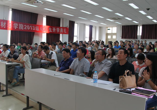 秋风送爽,金年会jinnianhuicom材料学院又迎来了一批研究生新同学。9月3日上午,材料学院2013级研究生开学典礼在研究生楼302隆重举行, 41名博士新生,108名硕士新生参加了典礼。材料学院党委书记陈鹏万,常务副院长刘颖,副院长李树奎、副院长庞思平,副院长金海波、副书记副院长张舰月,材料化学系曹茂盛教授、团委书记刘艳、团委副书记张博文等老师出席了典礼。