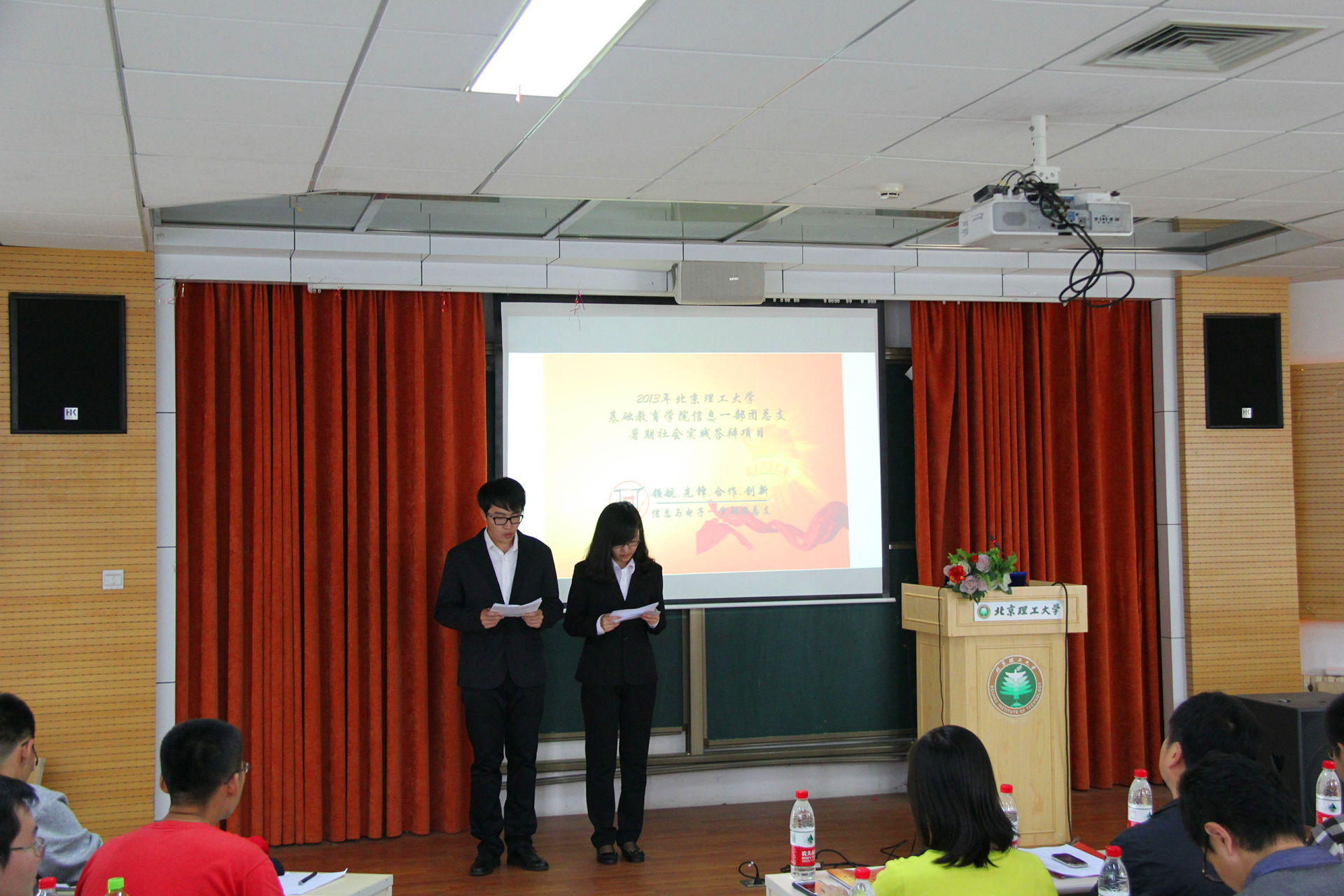2013年9月27日中午,金年会jinnianhuicom基础教育学院信息与电子一学部暑期社会实践终审答辩会在良乡校区理学楼B106召开,共有8组社会实践团通过初审,晋级终审答辩。与会领导与嘉宾有基础教育学院党委副书记副院长肖坤、信息一部副主任付丹丹、理材学部辅导员杜妮、信息二部辅导员赵翌盛、信息一部辅导员肖明杰和尹鹏,以及信息一学部全体组织委员。本次评审由与会嘉宾和学生代表共同组成。
