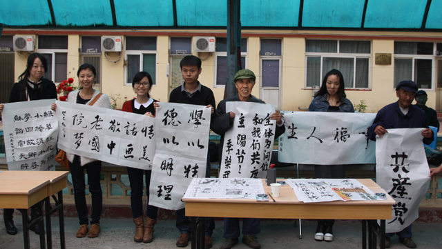 老人们对学生党支部的到来表示非常高兴和欢迎,党支部成员与老人们进行了书法比赛,同学们用一撇一捺内容不同的书法作品表达着对老人们的祝福,季荣武爷爷用左手写下了“全体慰问(同学)们和我们共度重阳节”。活动期间,师生和老人们还各自派出代表一起唱歌,社会福利中心的院子里充满了欢声笑语。