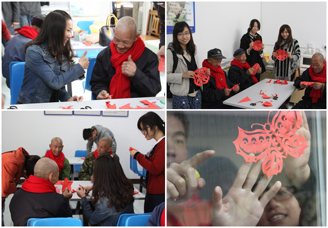 学生党支部还在活动中教老人们剪纸,在同学们耐心的指导下,经过一个多小时的努力,老人们把色彩缤纷的蜡光纸裁剪出了各种美丽的图案,每幅作品构思巧妙,老人们在学习的过程中都非常认真,无论是动物还是花草,都展现得淋漓尽致,每一张剪纸都凝聚着老人们的爱心,最终的成果让大家赞叹不止。