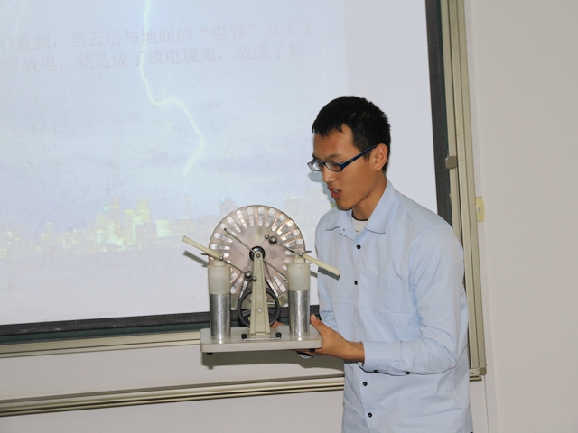 12级本科生谢富勇、袁恺和肖常涛小组在演示雷电产生的原理
