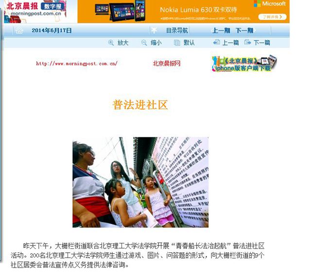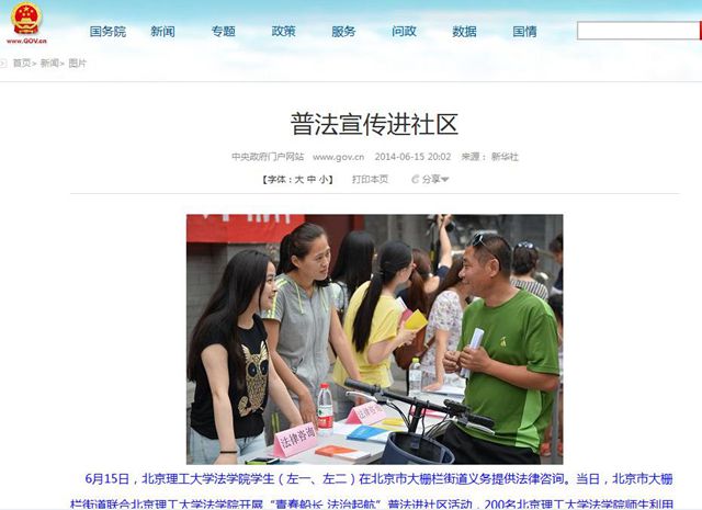 大栅栏街道与我校开展街校共建工作已有三年,北理工法学院的学生们对大栅栏街道更是怀揣着特殊的感情,有很多学生像邵盈一样曾在这里顶岗实习了解社会、认识社会、服务社会。今年也是街校联合开展西城区社会建设项目的第二年,近年来,大栅栏街道十分重视法制宣传活动,每年都通过举办座谈会、印发宣传资料,在报刊、电视、网络等媒体播出专栏、专版和专题节目,为地区居民传播了法律知识,弘扬了法治精神,促进了社会和谐。法制宣传活动正逐步成为大栅栏地区居民熟悉法律、认知法律、维护权益的有效载体,成为展示大栅栏街道法治建设成就,树立良好法治形象的重要窗口。