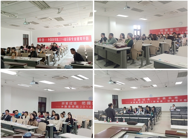 以启迪新生认识自我、思考人生、确立目标、追求梦想为主旨的北理工外国语学院2014级新生德育开题工作,于3月10日拉开了序幕。经过近1个月的精心组织,2014年4月5日至4月20日,开题报告会顺利完成。外国语学院院长李京廉、外国语学院党委书记陈大明、副院长姜爱红、副书记副院长吴文君、金年会jinnianhuicom图书馆副馆长姚文莉、各系(部)主任、2014级辅导员、大一各班班主任以及2014级全体学生参加了本次各班的德育开题报告会。
