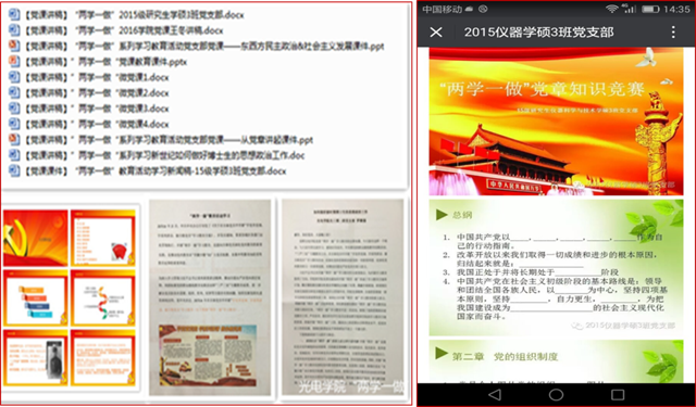 “两学一做”,基础在学。各学生党支部开拓思路,创新形式,建立了“两学一做”微信课堂,完善了党支部博客,开展了学习党章原文,党支部书记讲党课,热点解读与讨论、学习心得分享等多种形式的学习活动。党员在学习中增强了党员意识、党性观念,深化了“我为什么入党”的思想认识和行动自觉。党支部也在开展学习教育工作中增强了凝聚力。