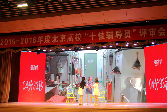 此前,我校通过学院推荐、专家评审、网络公示等程序进行校内选拔,最终确定计算机学院张杨为北京高校“十佳辅导员”推荐人选并向北京市委教育工委提交申报材料。在接到参加评审会现场展示的通知后,学生工作处第一时间牵头组建视频制作和选手培训的专家团队,成员包括宣传部、计算机学院、数学与统计学院、人文与社会科学学院、设计与艺术学院的专业制作人员和指导专家,在短短的4天时间内,制作完成以“信仰归来”为主题的既展现个人工作事迹风采又反映我校“延安根•军工魂”特色文化的展示视频,同时,梳理我校辅导员日常工作中的典型事务和突发应急事件处理案例,与张杨一起分析并模拟演练。
