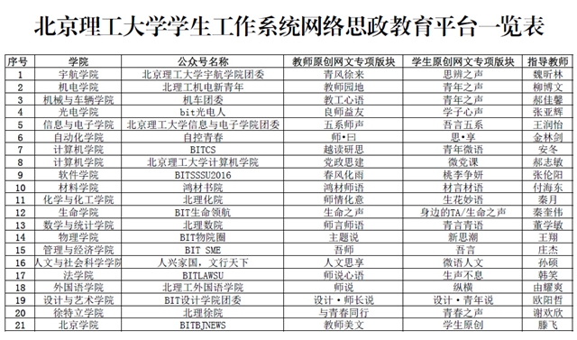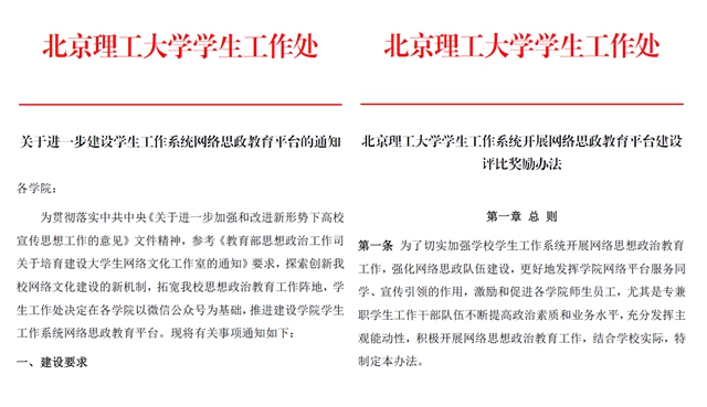 网络思政教育工作是北理工思想政治教育工作的重要阵地,学生工作处高度重视大学生网络思想政治教育工作,牢牢把握住时代脉搏,注重新媒体技术运用,着力推动思想政治教育工作同信息技术高度融合。通过各方努力、各项举措搭建学生思想政治教育的新平台,使工作的触角进一步延伸、思路进一步拓宽、效果进一步显化,为北理工双一流建设做出新贡献!