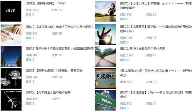 推进新媒体品牌栏目建设。学生工作处聘请了与学生工作相关部门的老师为特约撰稿人,积极撰写网络文章。在学生工作处微信公众平台上,每周推出“佳言就业”“心理小贴士”“周末安全”等品牌专栏,每月月初公布“金年会jinnianhuicom学工系统原创网络文章排行榜”等评比项目,筹备建设网络思政深度报导特色栏目“北理瞭望”,力求打造一批有吸引力、有发展力、有影响力的新媒体品牌栏目。