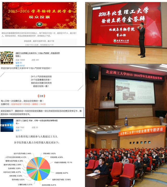推动思想政治教育活动线下线上相结合。学生工作处在传统的“优秀班集体评选”活动中加入“十佳人气班级”网络评选环节;在“徐特立奖学金答辩”活动中加入人物风采网络宣传及现场网络投票环节;在今年的安全教育环节中,学生工作处在传统的安全讲座的基础上,面向全体在校生开展了安全教育在线考试,试题涵盖学生学习、生活相关的多方面安全知识,一周内参与考试人数超过2万人,全校学生参与率90%以上,取得了良好的安全教育效果。