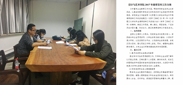 4月,学院成立以党委副书记副院长孙飞为组长,辅导员、班主任、毕业班班长为组员的德育答辩工作小组,认真学习和贯彻文件精神,通过院务会、德育答辩工作小组会议的形式召开组织筹备会,根据“大学 青春 人生”主题,制订今年德育答辩的具体实施方案,并形成文件《设计与艺术学院2017年德育答辩工作方案》。方案确定以后,学院通过网站公告栏、毕业生微信群等网络形式进行了广泛的宣传,并以纸质文件的形式下发到各毕业班,并先后召开班长支书例会、毕业生动员会,传达有关精神和具体实施方案,即时解答同学的疑问,保证将宣传工作覆盖到每一位毕业生。