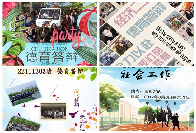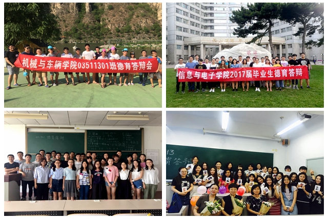 各班级学生在德育答辩时也畅所欲言,借助视频、音乐、图片等多种媒介进行形式多样的德育答辩。机械与车辆学院03511301班选在十渡风景区作为德育答辩的场地,以宁静生活、积极进取、团结一致答辩主题,选取宁静的农家院、仙西山、竹筏场地为答辩地点,在欢快、放松的环境下进行了不一样的答辩;信息与电子学院05111311班全体同学在中心花园顺利举行了德育答辩结题报告会,来自电子信息工程信号与图像处理方向的31名同学畅谈自己的大学生活,总结了四年来的成长经历;化学与化工学院10411301班德育答辩没有采取以往每位同学单独讲ppt的形式,而是以“我的四年是一首歌”为主题,每人根据个人四年生活,推荐一首能代表此刻心情的歌曲,与大家在歌声里分享四年心路历程;外国语学院24131301班精心为每一位老师和学生制作了一套明信片,每一套里面都包含所有德语系教师和学生的照片,并且专门将各个老师和学生的照片放在了封面,作为德育答辩的纪念礼物,为每个即将离开北理的学子们留下珍贵的回忆。