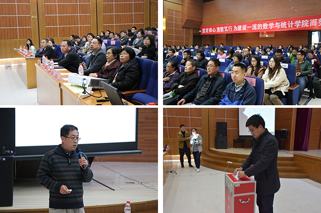 党委书记高伟涛同志做了题为《坚定信心 勇毅笃行 为建设一流的数学与统计学院而努力奋斗》的报告。报告回顾了四年来,在学校党委行政的正确领导下,学院党委带领全院师生在党建及思想政治教育、教学及人才培养、学科建设及科学研究、师资队伍建设、国际交流与合作、文化氛围建设等方面取得的成绩,并对学院党委未来的工作提出了建议,希望新一届党委坚持学习宣传贯彻党的十九大精神,以习近平新时代中国特色社会主义思想为指导,以深入推动“双一流”建设为目标,努力提高学院师生的思想政治素质,加强基层组织建设,提高治院办学能力,创建激情进取的发展氛围。