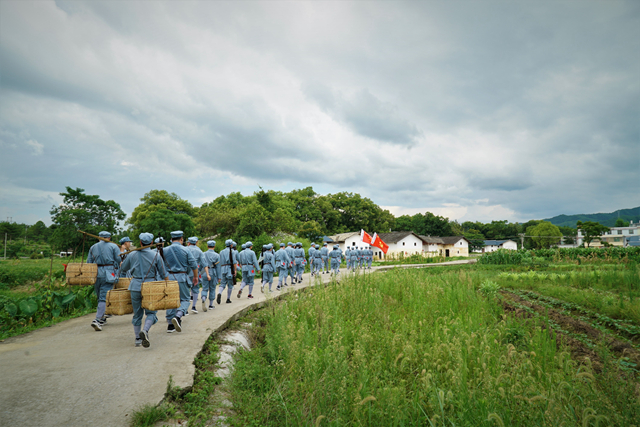 全体参训学员前往中央红军出发地——云石山,开展《重走长征出发路》的体验教学,学员们身着红军服,背起刀枪,挑起扁担,吹响军号,从红军长征的起点出发,穿过农田乡村,通过重走长征出发路,身临其境,感悟“初心之路”。在行军中,学员们还开展了挑粮竞赛、学唱红军歌曲、“飞夺泸定桥”等互动体验环节。在赣南的烈日下,红军服被汗水完全浸透,但学员们全程精神昂扬地登上了云石山。