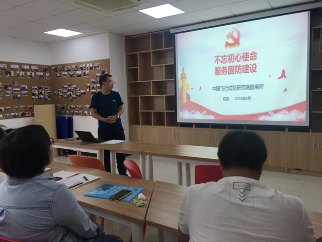 航电所党总支委员、所长段亚作了《不忘初心使命,服务国防建设》的报告,带领与会党员共同学习了共产党人的初心和使命,讲述了航空人践行航空报国初心、航空强国使命的实践,介绍了试飞人“向国家负责”精神在工作中的体现。他希望大家要坚定理想信念,树立远大理想,胸怀家国情怀,珍惜青春韶华,既要“仰望星空”,又要“脚踏实地”,为实现中华民族伟大复兴的中国梦而努力奋斗。