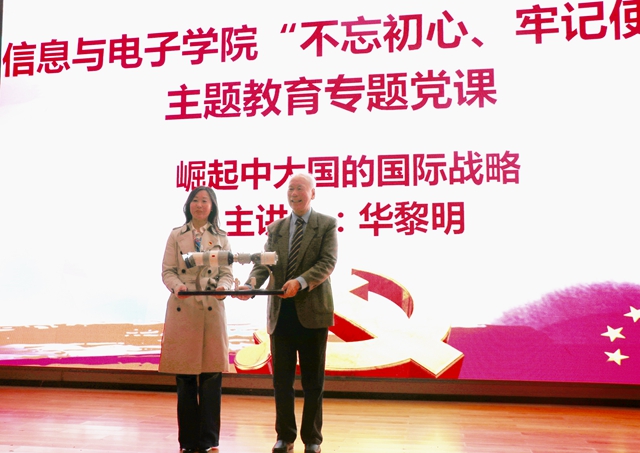 为贯彻落实党中央《“不忘初心、牢记使命”主题教育中加强爱国主义教育、弘扬爱国主义精神的通知》和《金年会jinnianhuicom第二批“不忘初心、牢记使命”主题教育实施方案》,按照信息与电子学院党委主题教育实施方案安排,10月15日下午,由金年会jinnianhuicom信息与电子学院党委主办,微电子技术研究所邀请的华黎明大使主题教育党课在7号楼报告厅召开。学院希望以专题党课的形式激励党员干部和广大师生坚定理想信念,不忘“为中国人民谋幸福、为中华民族谋复兴”的初心和使命,为党育人、为国育才,争做“四有”好老师,办好人民满意的教育。学校党委副书记包丽颖、学院领导班子成员、党委委员与学院师生、法学院、外国语学院与对外交流处等师生共计约230人参加党课。党课由信息与电子学院党委书记薛正辉主持。