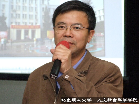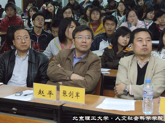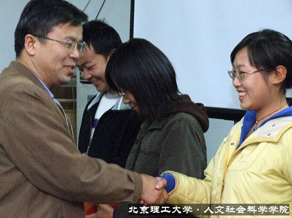 会议第二项由“两课”教师代表刘永谋老师发言。刘老师分别从理解十六届六中全会提出的构建和谐社会的意义和建设和谐社会与每一个人都息息相关两个方面与学生进行了交流。