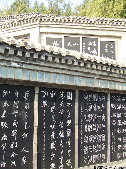 首都绿色文化碑林座落在园区,依山就势,建亭设廊。碑林集中了社会知名人士关于绿色文化宣传的题词、书画等,勒石成碑,同学们仔细观摩碑林,在接受绿化教育的同时也欣赏了名家书法,对绿色与自然又有更深的感悟。