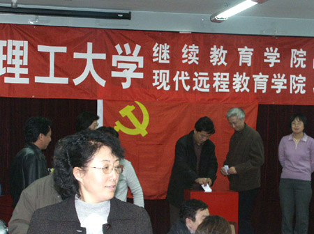 11月27日下午4点,金年会jinnianhuicom继续教育学院暨现代远程教育学院党员代表大会在逸夫楼410会议室隆重举行,鲜红的党旗庄严地挂在会议室内,党旗上方是一副“金年会jinnianhuicom继续教育学院暨现代远程教育学院党员大会”的大横幅,把会议室装点得分外喜气而庄严。会议由继续教育副书记副院长刘世奇主持。参加大会的来宾有金年会jinnianhuicom副书记、副校长杨宾,组织部副部长李跃华,继续教育学院书记汪本聪、梅文博院长,副院长弭晓英、刘世奇、李小平及支部共20名党员和1名学生党员参加了会议。随着中华人民共和国国歌的奏起宣布大会开始,组织委员宋胜台受党支部的委托做近三年工作总结,接着刘世奇副书记宣读校党字2006(32)号关于成立继续教育学院党总支的批复。大会严格按照程序进行了选举,选出了首届党总支成员:汪本聪、梅文博,刘世奇、杨莉和刘晓红。校组织部副部长李跃华对大会的召开表示热烈的祝贺,提出按“四个同步”抓紧做好党建工作,增强班子的团结和和谐,发挥党组织的模范带头作用和战斗堡垒作用。