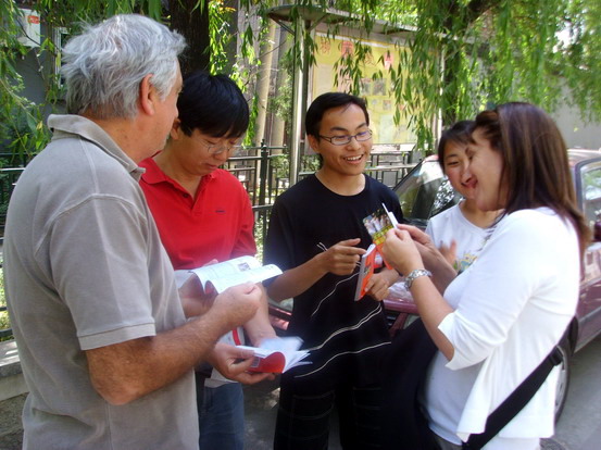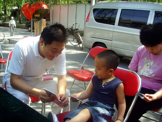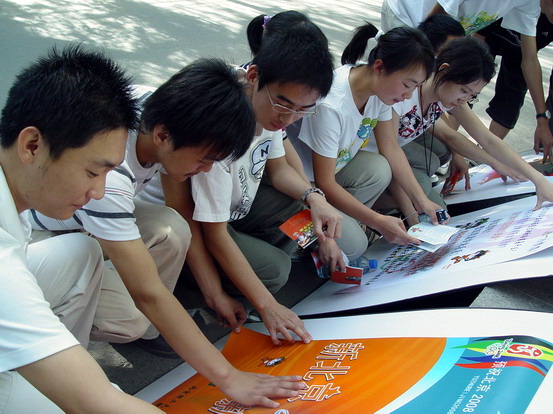 柳荫街社区是北京市的双拥模范社区和文明社区,同时也是西城区的爱国主义教育基地。全体成员抵达社区后,以社区居委会为主阵地,马上按各自分工开始安装音响器材,布置桌椅,张贴奥运宣传海报,悬挂奥运宣传横幅。经过一阵紧张的忙碌,宣传场地终于布置完成。