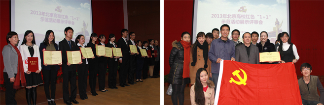 2013年,北京高校共有800多个学生党支部与农村、社区、企业、部队等党支部开展红色“1+1”共建活动,经过专家评审、现场展示评审等环节,我校设计学院2013级研究生党支部脱颖而出,荣获2012年度北京高校红色“1+1”示范活动一等奖;人文与社会科学学院2010级第二党支部等9个党支部荣获优秀奖;北理工荣获2013年北京高校红色“1+1”示范活动优秀组织奖。自2011年起,我校已连续三年荣获优秀组织奖。